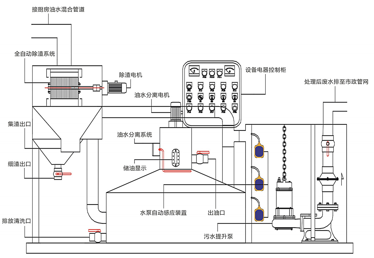 5,油水分離的污水通過虹吸裝置,確保水自動連續(xù)進(jìn)入入水室,符合排放標(biāo)準(zhǔn),并可以通過排污泵提升排入市政管網(wǎng).
